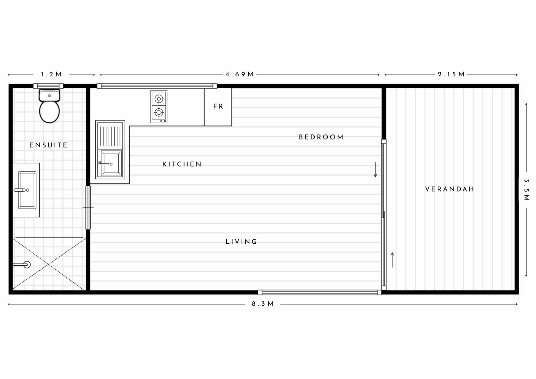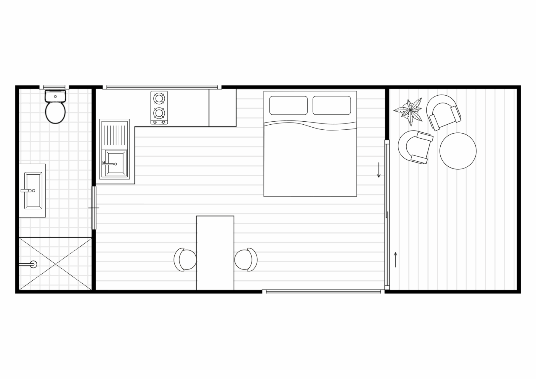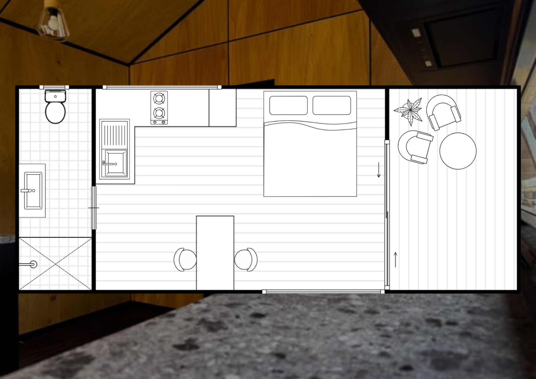 The Cabin is a studio-style granny flat offering 28.5 square meters of efficient living space, including an inviting verandah. It features a functional bathroom, a minimalist kitchen, and a versatile studio-style living area that doubles as the sleeping space, optimising every inch for comfort and practicality.