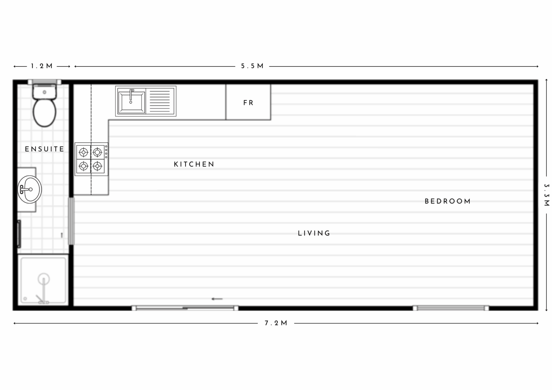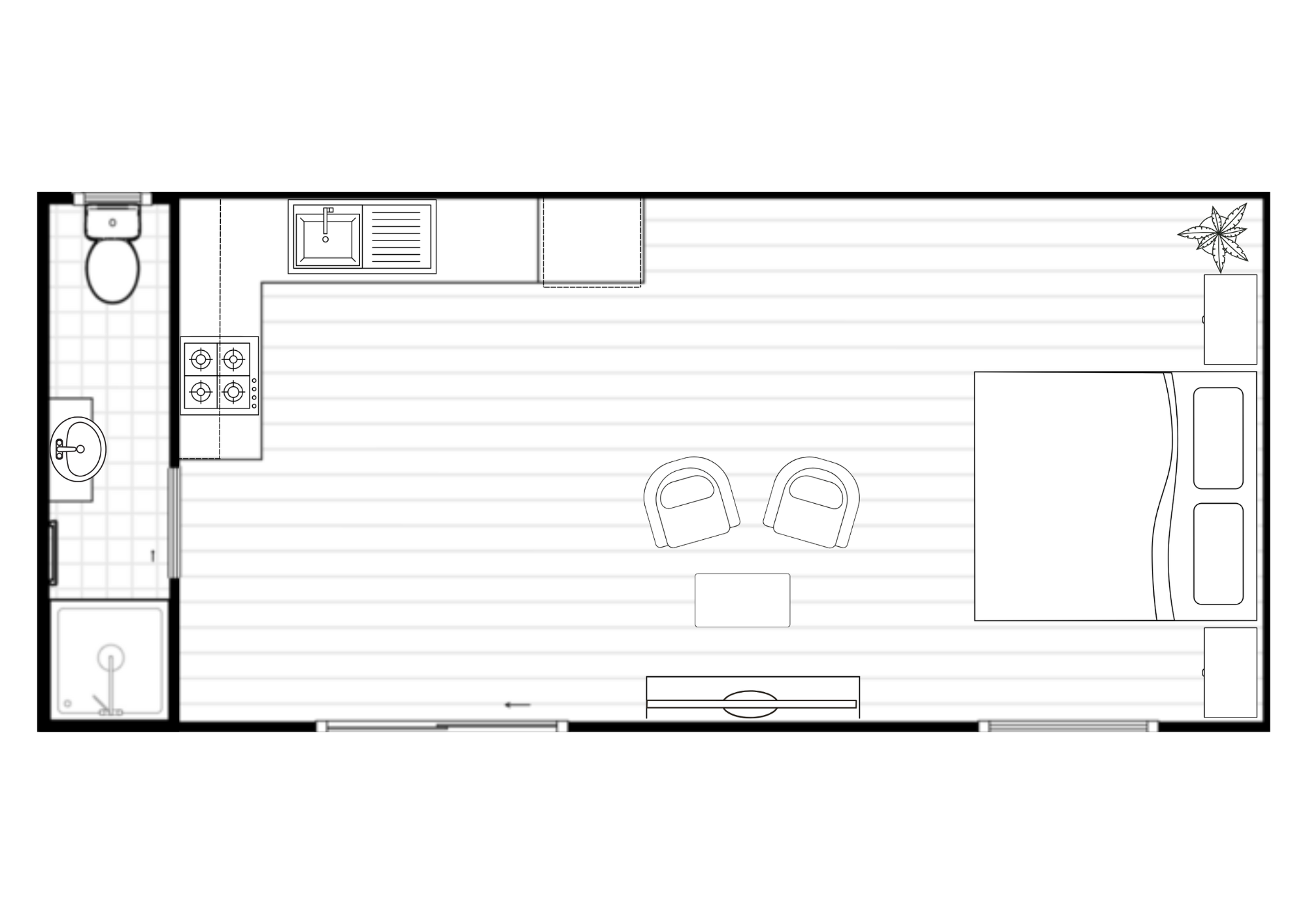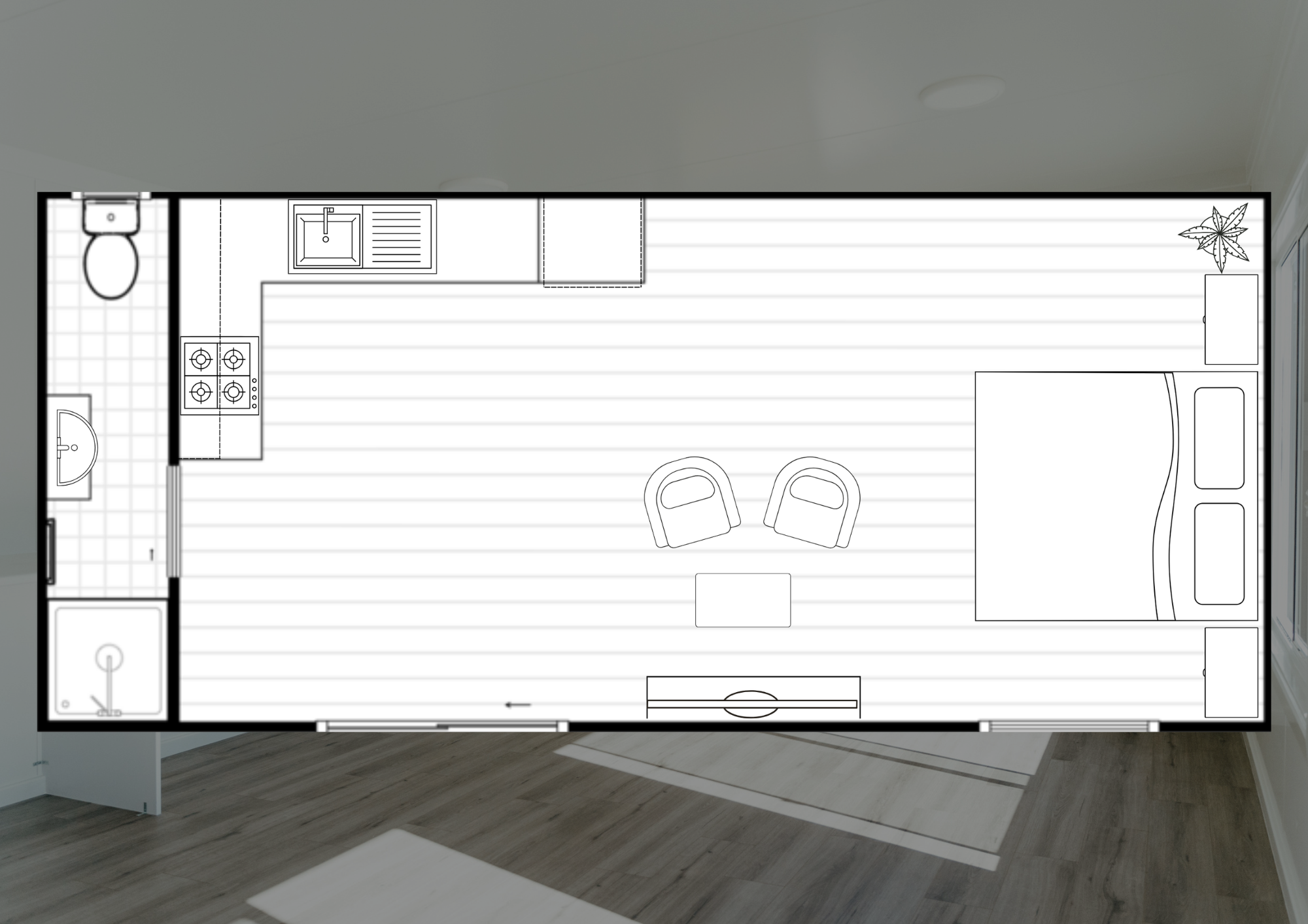 The Hopeland is a studio-style granny flat offering 23 square meters of efficient living space. It includes a functional bathroom, a minimalist kitchen, and a flexible studio-style area that serves as both the living and sleeping space, making the most of every square meter.